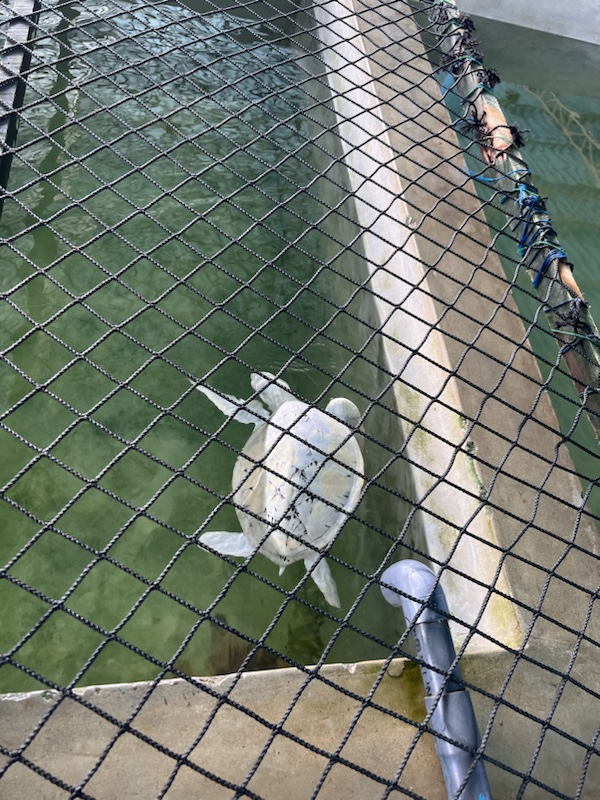 Es gab hier verschiedenen Bereiche. Ein Sandbereich, wo die Eier vergraben waren, Becken in denen die wenige Tage alten Jungtiere schwammen und Becken mit verletzten Tieren. Einige von ihnen werden dort behandelt, weil sie z.B. Hautkrankheiten haben. Diese werden nach abgeschlossener Behandlung wieder freigelassen. Andere haben schwerwiegendere Verletzungen. Einer Schildkröte fehlten nach einem Haiangriff drei Beine, diese kann nicht mehr ausgewildert werden. Es gab auch Schildkröten, die nicht mehr untertauchen konnten, da sie zu viel Plastik gefressen haben. Außerdem gab es zwei Albinoschildkröten, die eine große Seltenheit sind. Aufgrund dessen werden diese auch nicht frei gelassen, da die Gefahr groß ist, das sie gefangen werden und auf dem Schwazmarkt verkauft werden.