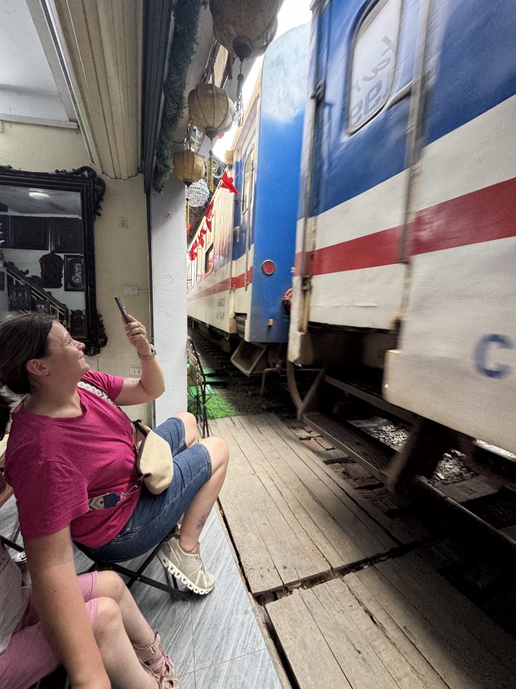 Kurz vor dem Ankommen des Zuges wurde es hektisch. Die Cafés packten die Tische, Stühle und Ventilatoren zur Seite. Auch unsere Stühlen wurden nach hinten verschoben. Der Zug kündigte sich durch ein Hupen an und fuhr relativ zügig durch die schmale Gasse. Es war ein imposantes Erlebnis.