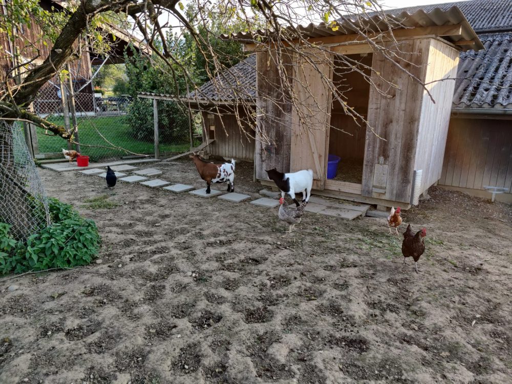Hier wohnen wir zwischen Kühen, Pferden, Hühnern und Ziegen.